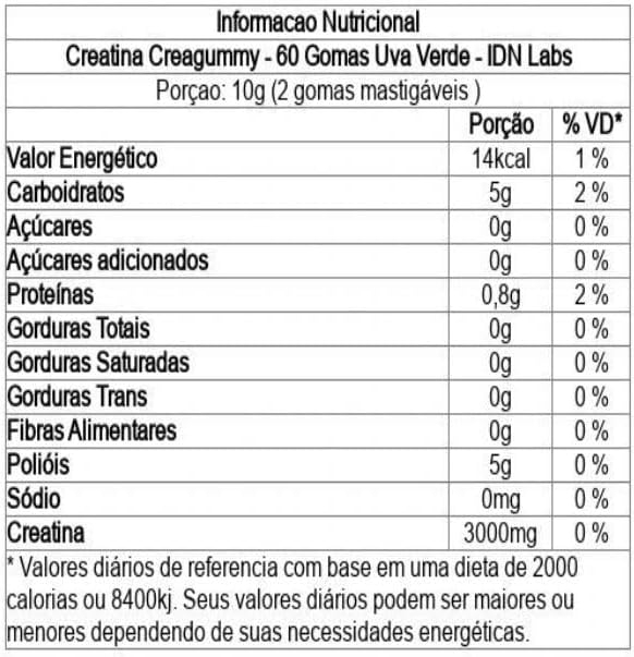 Creatina Monohidratada, maltilol, sorbitol, gelatina, pectina, ácido cítrico, ácido lático, aroma idêntico ao natural de uva, cera de carnaúba, triglicerídeos de cadeia média, sorbato de potássio, corante azul brilhante FCF.